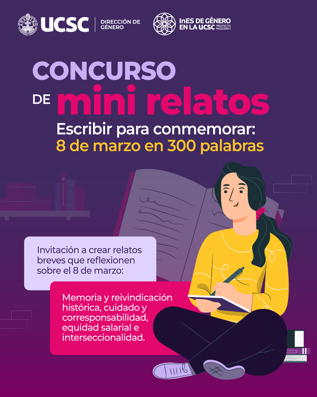 Concurso de minirelatosEsta convocatoria invita a dejar testimonio desde la creatividad y la sensibilidad literaria, aspectos que atraviesan las vidas de las mujeres en los distintos territorios y en las diferentes etapas del ciclo vital. Asimismo, se invita a compartir relatos con distintos estilos, que inviten a reflexionar en torno a las siguientes temáticas: Memoria y reivindicación histórica, cuidado y corresponsabilidad, equidad salarial e interseccionalidad. Las creaciones deberán inspirarse en la fecha conmemorativa del 8 de Marzo, las que podrán abordar con enfoque simbólico, reflexivo o poético, las categorías de Memoria y reivindicación histórica, cuidado y corresponsabilidad, equidad salarial o interseccionalidad. Extensión del relato Cada mini relato deberá tener una extensión máxima de 200 palabras incluido el título. Los cuentos seleccionados se publicarán en un libro digital de Ediciones UCSC. Iniciativa cuenta con el Patrocinio de la Dirección de Género y Facultad de Educación, a través de los departamentos de Currículum evaluación y tecnologías en Educación y Ciencias del Lenguaje y Literatura, el Centro de la Dirección de biblioteca de la UCSC, Ediciones UCSC.
